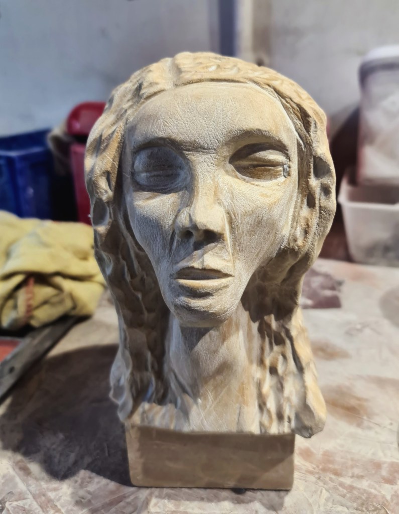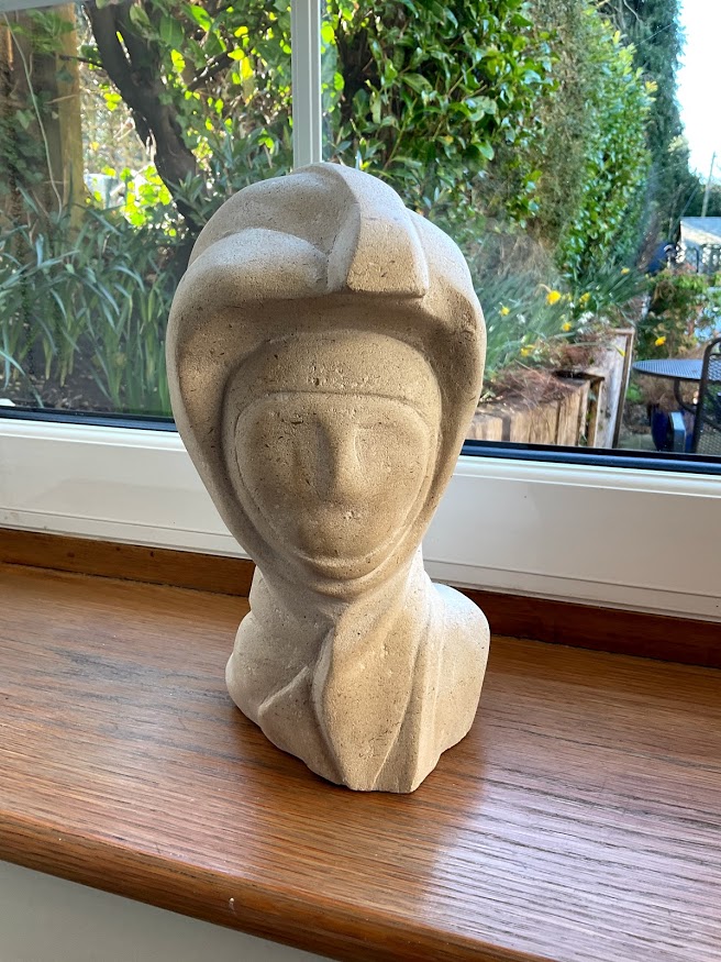 Spanish Soapstone on Alabaster. This a take on the Sixteenth century humanist philosopher, Juan Luis Vives. He was an early advocate for the education of women. Vives was originally from Spain, before he was exiled to England, so the use of Spanish stone seems particularly apt.
